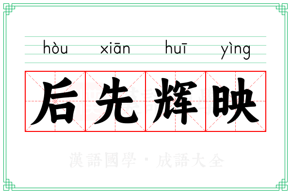后进与前辈相互烘托,益显彼此的成就。如:“这对师生在物理学界都有新发现,后先辉映,受人崇仰。”
