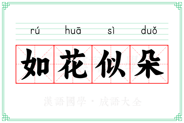 出处明・施耐庵《水浒传》第101回:“轿子里面,如花似朵的一个年少女子。”