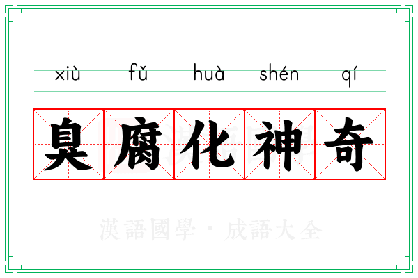 臭腐化神奇,汉语成语,读音是(xiù fǔ huà shén qí 朗读)。主谓式结构,臭腐化神奇意思是:腐败臭恶的转化为神奇美好的。比喻坏事变为好事,无用变有用。出自战国・宋・庄周《庄子・知北游》。一般作宾语、定语,用于书面语。