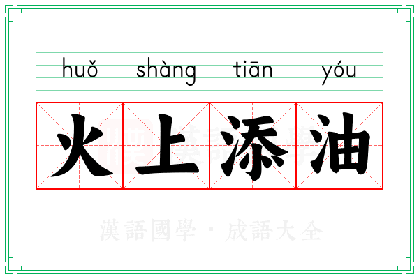 比喻使事态愈加扩张或恶化。如:“你这样做,不是火上添油吗?”亦作“火上加油”、“火上烧油”。