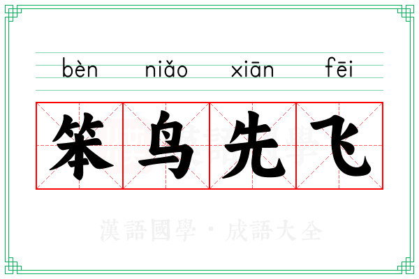 比喻能力差的人,做事时唯恐落后,往往比别人先动手。今多用作谦词。如:“我自知能力不如人,但也知道笨鸟先飞这个道理可以弥补自身的缺点!”亦作“坌鸟先飞”、“笨雀先飞”。