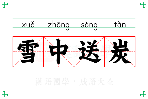 在下雪天送炭给人取暖。比喻在人艰困危急之时,给予适时的援助。※语或本唐・释德行《四字经・甲乙》。