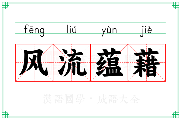 蕴藉,蕴含不露。风流蕴藉形容人风流潇洒,含蓄有致。《北齐书・卷三十一・王昕传》:“昕母清河崔氏,学识有风训,生九子,并风流蕴藉,世号王氏九龙。”《初刻拍案惊奇・卷二十五》:“他见院判风流蕴藉,一心待嫁他了。”亦作“风流酝借”。