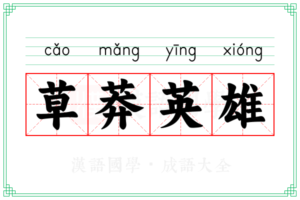 出处:冯铿《红的日记》:“胸前和肩膀上缠着眩着人眼的红色标帜,真是个‘草莽英雄’的气慨。”