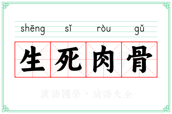 语本左传・襄公二十二年:“吾见申叔夫子,所谓生死而肉骨也。”《杜预・注》:“已死复生,白骨更肉。”比喻恩施深重,恩同再造。《周书・卷十一・晋荡公护传》:“一得奉见慈颜,永毕生愿。生死肉骨,岂过今恩。”《南唐・徐铉・又代萧给事与楚王书》:“存者荷二天之恩,没者释九原之恨,则生死骨肉,未可比量。”