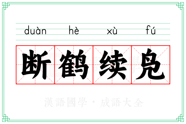 截断鹤的长腿,接到野鸭的短脚上。语本《庄子・骈拇》:“长者不为有余,短者不为不足,是故凫胫虽短,续之则忧,鹤胫虽长,断之则悲。”比喻做事违反自然的本性。《聊斋志异・卷二・陆判》:“断鹤续凫,矫作者妄;移花接木,创始者奇;而况加凿削于肝肠,施刀锥于颈项者哉?”
