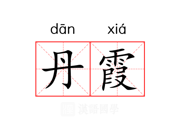 明•夏完淳 《叙怀》诗:“丹霞照深池,清暉被嘉树。”比喻红艳的色彩。