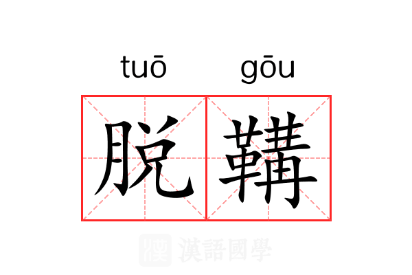 拼音 tuō 部首 肉 总笔画 11脱 [ tuō ] 1. 离开,落掉。 如 脱产。脱发(fà)。脱节。脱离。脱落。脱贫(摆脱贫困)。脱稿(完成著作)。脱手。摆脱。挣脱。临阵逃脱。 2. 遗漏。 如 脱漏。脱误。脱文(因抄刊古书而误脱的字。亦称“夺文”)。 3. 取下,除去。 如 脱下。脱帽。脱氧。脱脂。脱胎换骨。 4. 倘若,或许。 如 脱有不测。 5. 轻慢。 如 脱略(放任,不拘束)。脱易(轻率,不讲究礼貌)。轻脱(轻率,不持重,放荡)。 6. 姓。 [更多解释]