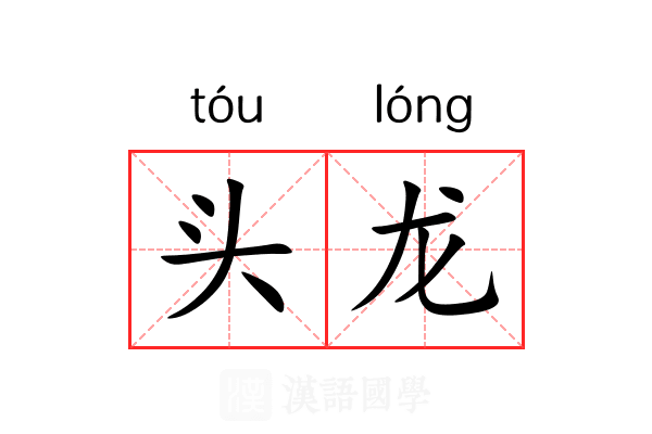 头龙的意思是:①.指东汉荀俭之子荀悦。语本《后汉书·荀淑传》:“有子八人:俭,绲,靖,焘,汪,爽,肃,专,并有名称,时人谓之'八龙'……悦字仲豫,俭之子也。俭早卒。悦年十二,能说《春秋》。家贫无书,每之人闲,所见篇牍,一览多能诵记。性沈静,美姿容,尤好著述。灵帝时阉官用权,士多退身穷处,悦乃托疾隐居,时人莫之识,唯从弟彧特称敬焉。初辟镇东将军曹操府,迁黄门侍朗。”②.犹龙头,指兄弟辈中有权威的长兄。