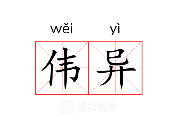 卓异出众;奇异。 南朝 宋 刘义庆 《世说新语·言语》:“卿观过 江 诸人,经纬 江 左,轨辙有何伟异?后来之彦复何如中原?” 宋 郭彖 《睽车志》卷四:“欲持归中国,为伟异之观。” 清 梅曾亮 《耻躬堂文集序》:“﹝ 彭士望 ﹞性豪迈,尽散金帛以交恢奇伟异之士。”