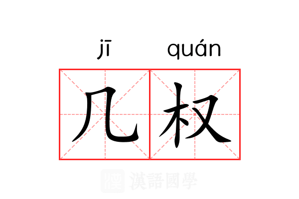 拼音 quán 部首 木 总笔画 6权 [ quán ] 1. 职责范围内支配和指挥的力量。 如 政权。权力。权威。权贵。权柄。权势。生杀予夺之权。 2. 有利的形势。 如 主动权。 3. 变通,不依常规。 如 权变。权谋(随机应变的计谋)。权术。智必知权。 4. 暂且,姑且。 如 权且。 5. 秤锤。 如 权衡。 6. 衡量,估计。 如 权其轻重。 7. 姓。 [更多解释]