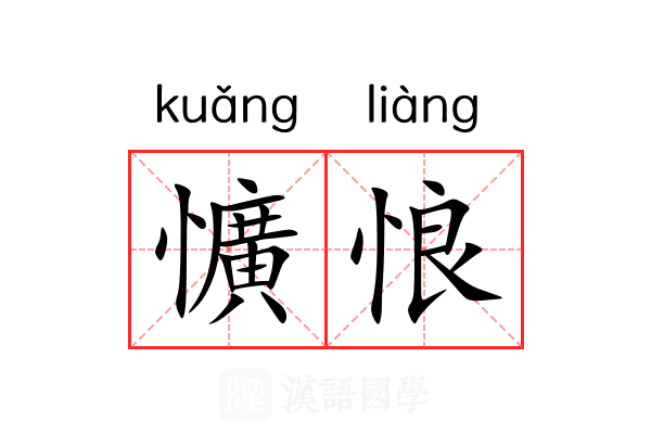 悢 [ liàng ] 1. 惆怅;悲伤。 如 悢然。悢悢(a.悲伤;b.眷念)。 [更多解释]