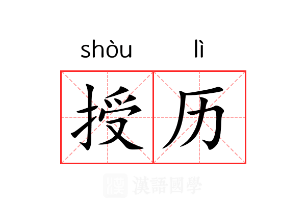 引南朝•陈 徐陵 《<玉台新咏>序》:“亦有岭上仙童,分丸 魏 帝;腰中宝凤,授历 轩辕。”宋•胡琦 《耕禄藳·代良耜谢表》:“兹盖恭遇皇帝陛下,授歷析因,分田友助,即功以知稼穡,靡或遑寧;亲耕以给粢盛,昭然示劝。”一本作“授历”。 明•沉德符 《野获编·历法·日圭同异》:“登封县 有观象、测景二臺,乃 周公 营 洛邑 时,手建遗蹟,其土圭表漏尚存,宜敕钦天官至彼考正制度尺寸,以凭授历。”