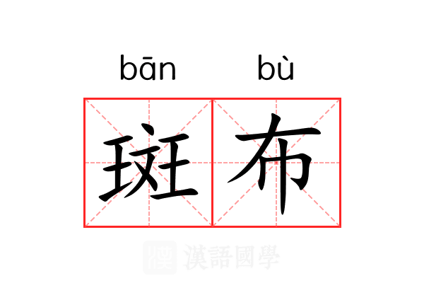 拼音 bān 部首 文 总笔画 12斑 [ bān ] 1. 一种颜色中夹杂的别种颜色的点子或条纹。 如 斑点。斑纹。斑斓。雀斑。斑秃。斑白。斑竹。斑驳(色彩错落)。管中窥豹,可见一斑(喻从看到的一部分,推测全貌)。 [更多解释]