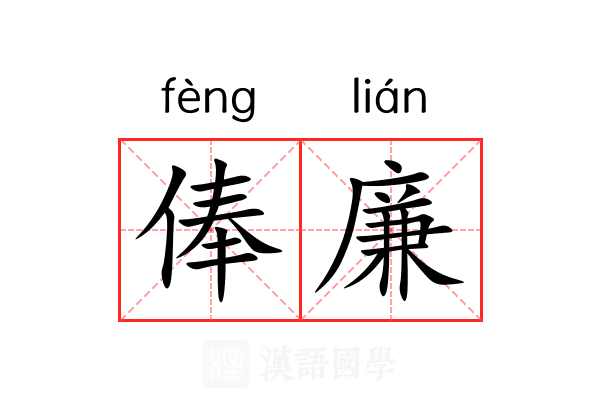 廉 [ lián ] 1. 堂屋的侧边。 如 廉隅(棱角,喻品行端方,有气节)。 2. 不贪污。 如 廉洁。廉正。廉明。 3. 便(pián )宜,价钱低。 如 物美价廉。 4. 察考,访查。 如 “且廉问,有不如吾诏者,以重论之”。 5. 姓。 [更多解释]