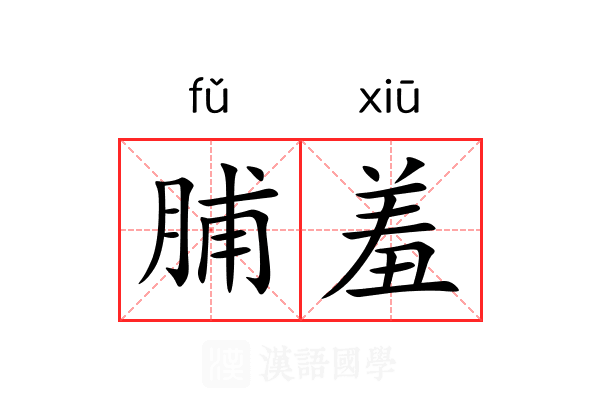 羞 [ xiū ] 1. 感到耻辱。 如 羞耻。羞辱。羞恶。 2. 难为情,害臊。 如 害羞。羞惭。羞臊(sào )。羞愧。含羞。羞赧(因害臊而红了脸的样子)。羞怯。羞涩。 3. 使难为情。 如 羞人。你别羞我。 4. 进献。 如 “羞玉芝以疗饥”。 5. 同“馐”。 [更多解释]