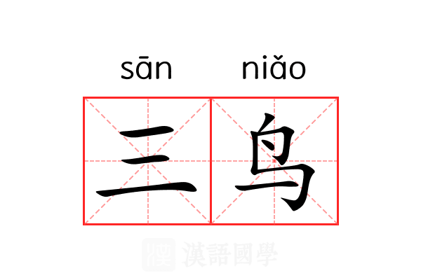 三鸟,sān niǎo,指古代神话中 西王母 身边的三只青鸟。亦为使者的泛称。典源《山海经·山经》卷二〈西山经〉~54~