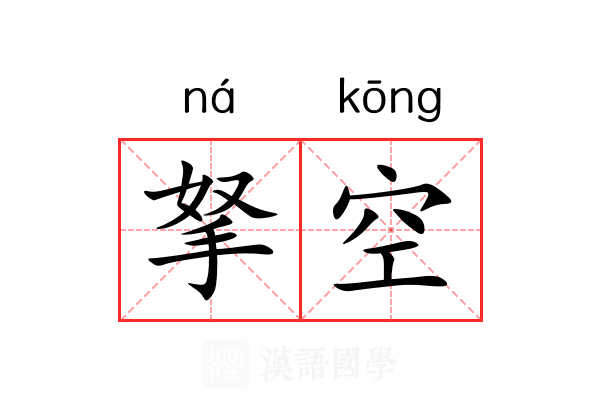 拼音 kōng,kòng,kǒng 部首 穴 总笔画 8空 [ kōng ] 1. 不包含什么,没有内容。 如 空洞(a.没有内容的;b.物体内部的窟窿)。空泛。空话。空旷。空乏。空空如也。空前绝后。凭空(无根据)。真空(没有任何东西)。 2. 没有结果的,白白地。 如 空跑了一趟。空口无凭。 3. 离开地面的,在地上面的地方。 如 空军。空气。空投。空运。 空 [ kòng ] 1. 使空,腾出来。 如 空一个格。空出一间房来。 2. 闲着,没被利用的。 如 空白。空地。空额。空房。空缺。 3. 亏欠。 如 亏空。 空 [ kǒng ] 1. 古同“孔”,洞。 [更多解释]