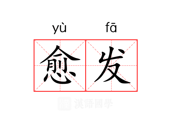 拼音 yù 部首 心 总笔画 13愈 [ yù ] 1. 更,越。 如 愈甚。愈加。愈发。愈益。愈演愈烈。 2. 较好,胜过。 如 孰愈(哪个好)?彼愈于此。 3. 病好了。 如 痊愈。病愈。 [更多解释]
