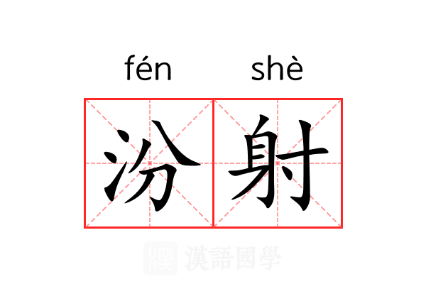 拼音 shè,yè,yì 部首 寸 总笔画 10射 [ shè ] 1. 放箭。 如 射箭。后羿射日。 2. 用推力或弹力送出子弹等。 如 射击。扫射。发射。射程。射手。 3. 气体或液体等受到压力迅速流出。 如 喷射。注射。 4. 放出光、热、电波等。 如 射电。辐射。射线。照射。反射。 5. 有所指。 如 暗射。影射。 射 [ yè ] 1. 〔~干〕古书上的一种草,根可入药。 2. 〔仆~〕中国秦至宋代的官名,宋代以后废。 射 [ yì ] 1. 〔无~〕①中国古代音乐十二律之一;②中国春秋时景王所铸钟名。 [更多解释]