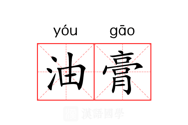 油膏的意思是:用于皮肤的软膏,特指含脂类或油脂类物质(如凡士林、猪油、羊毛脂)为基质的半固体药物制剂。