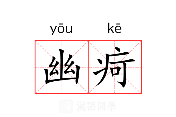 幽 [ yōu ] 1. 隐藏,不公开的。 如 幽会。幽居(a.隐居;b.幽静的住处)。幽愤。幽咽。 2. 形容地方很僻静又光线暗。 如 幽谷。幽静。幽暗。 3. 沉静而安闲。 如 幽闲。幽趣(幽雅的趣味)。幽婉。 4. 把人关起来,不让跟外人接触。 如 幽禁。幽闭。幽囚。 5. 迷信的人指阴间。 如 幽灵。幽魂。 6. 古地名,大致相当于今中国河北省、辽宁省南部一带。 如 幽州。幽燕(yān )。 [更多解释]