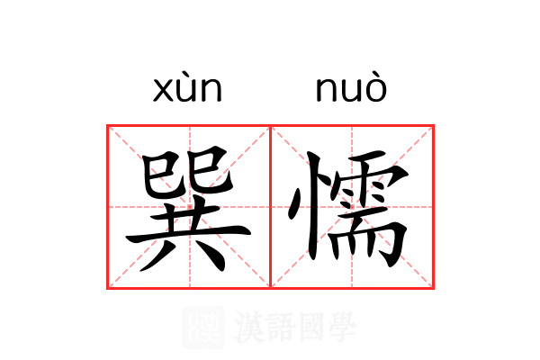 引宋•岳珂 《桯史·吴畏斋谢贽启》:“自 崇 观 撤藩之蔽而 炎 兴 纷和战之谋,诞谩败事而巽懦则有餘。”《明史·杨思忠传》:“诸边将惰卒骄,寇至輒巽愞观望。”清•王夫之 《读四书大全说·论语·子路篇九》:“若只在不骄上用功,则且流入巽愞拘葸去。”梁启超 《袁督师之冤狱》:“时( 崇禎 二年)督 蓟 者为 刘策,巽懦不知兵事。”