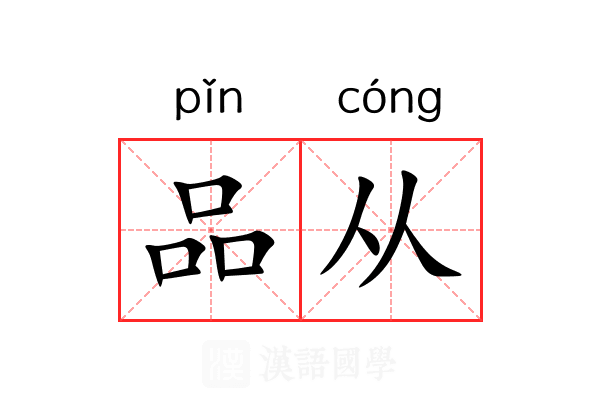 拼音 cóng,zòng 部首 人 总笔画 4从 [ cóng ] 1. 跟随。 如 愿从其后。 2. 依顺。 如 顺从。盲从。从善如流。 3. 采取,按照。 如 从优。 4. 从事;参加。 如 从业。从政。投笔从戎。 5. 由,自。 如 从古至今。从我做起。 6. 跟随的人。 如 侍从。仆从。 7. 宗族中次于至亲的亲属。 如 从父(伯父、叔父的通称)。 8. 次要的。 如 主从。从犯。 9. 中国魏以后,古代官品(有“正品”和“从品”之分,宋代龙图阁大学士为从二品)。 10. 姓。 [更多解释]