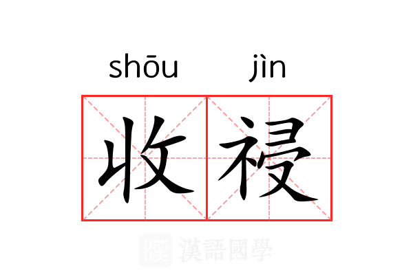 拼音 shōu 部首 攴 总笔画 6收 [ shōu ] 1. 接到,接受。 如 收发。收信。收支。收讫。收益。 2. 藏或放置妥当。 如 这是重要东西,要收好了。 3. 割断成熟的农作物。 如 收割。收成。麦收。 4. 招回。 如 收兵。收港。 5. 聚,合拢。 如 收容。收理。收集。 6. 结束。 如 收尾。收煞。收盘。 7. 逮捕,拘押。 如 收捕。收监。收押。收审。 8. 约束,控制(感情或行动)。 如 收束。收心。收伏(亦作“收服”)。 [更多解释]