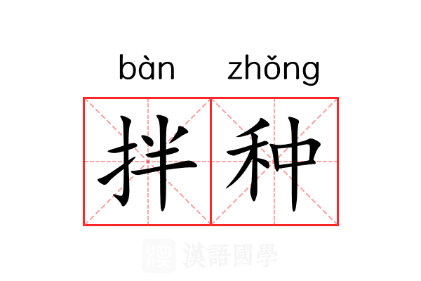 拼音 zhǒng,zhòng,chóng 部首 禾 总笔画 9种 [ zhǒng ] 1. 生物在生态和形态上具有不同特点的分类的基本单位。 如 物种。种差(chā), 2. 植物果实中能长成新植物的部分,又泛指生物传代繁殖的物质。 如 种子。种禽。种畜。撒种。配种。 3. 具有共同起源和共同遗传特征的人群。 如 人种。种族。 4. 量词,表示类别、式样。 如 种种。两种人。 5. 指胆量或骨气。 如 有种。没种。 种 [ zhòng ] 1. 把种子或幼苗等埋在泥土里使生长。 如 种地。栽种。 种 [ chóng ] 1. 姓。如宋代有种师道。 [更多解释]