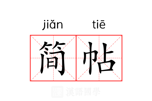 简帖的意思是:书信、文件。元·郑光祖也作「柬帖」、「简子」。