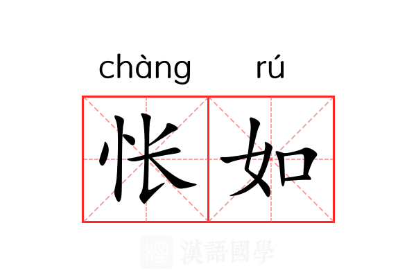 拼音 chàng 部首 心 总笔画 7怅 [ chàng ] 1. 失意,不痛快。 如 怅然若失。怅恍(恍惚)。怅望(怅然怀想)。怅惘。怅惋。怅怅。惆怅。 [更多解释]