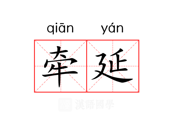 引明•归有光 《与傅体元》之一:“僕思归之心甚切,中祕有书数万卷,欲读一过,为此牵延未能决也。”中国近代史资料丛刊《辛亥革命·孙文革命运动清方档案》:“黄槐森 官声素好,军务或非所长,儻牵延日久,兵机销钝……后患伊于胡底。”郭沫若 《反正前后》第二篇一:“对于革命党人的屠杀,对于立宪运动的牵延敷衍……这些都是封建势力的独裁专擅、倒行逆施的表现。”