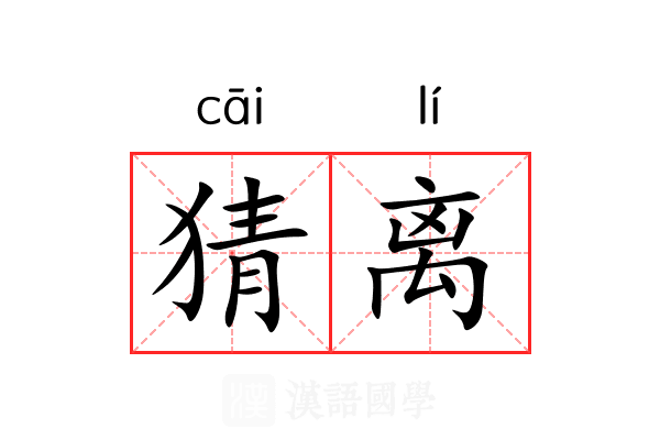 拼音 cāi 部首 犬 总笔画 11猜 [ cāi ] 1. 推测,推想。 如 猜测。猜断。猜透。猜中(zhòng)。猜想。猜度(duó)。 2. 疑心,嫌疑。 如 猜疑。猜忌。猜嫌。猜拳(饮酒时助兴的游戏。亦称“划拳”)。 [更多解释]