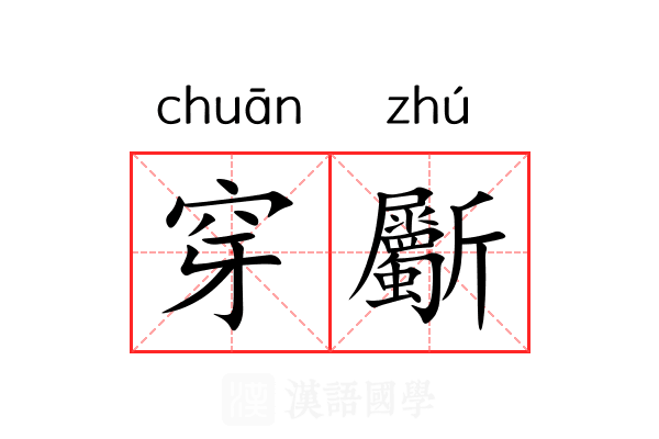 穿 [ chuān ] 1. 破,透。 如 穿透。揭穿。穿窬(钻洞和爬墙,指盗贼)。穿凿。 2. 通过,连通。 如 穿过。穿行(xíng )。 3. 着(zhuó)衣服鞋袜。 如 穿衣。穿鞋。 [更多解释]