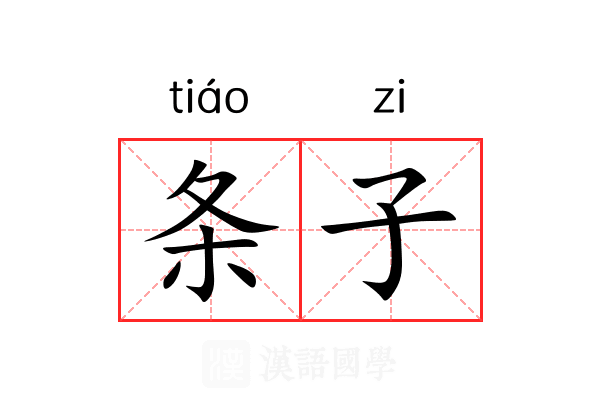 拼音 tiáo,tiāo 部首 木 总笔画 7条 [ tiáo ] 1. 植物的细长枝。 如 枝条。柳条儿。荆条。 2. 泛称条形的东西。 如 条子。面条儿。便(biàn)条儿。金条。铁条。 3. 细长的形状。 如 条形。条纹。条案。条几(jī)。条凳。条幅(直挂的长条字画)。苗条。身条。 4. 项目,分项目的。 如 条例。条令。条文。条陈(a.分条叙述;b.旧时向上级分条陈述的文件)。 5. 层次,秩序。 如 条理。条贯。有条不紊。 6. 量词。 条 [ tiāo ] 1. 挑取。 如 “蚕月条叠”。 [更多解释]