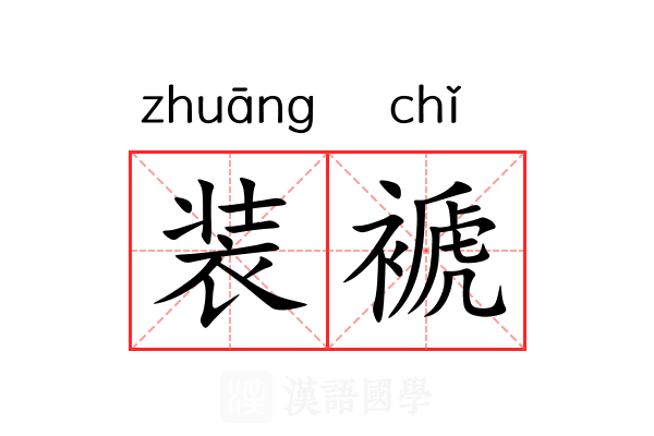 拼音 zhuāng 部首 衣 总笔画 12装 [ zhuāng ] 1. 穿着的衣物。 如 服装。便装。军装。中山装。装裹。 2. 特指演员演出时的穿戴打扮。 如 上装。卸装。 3. 特指出行时带的东西。 如 治装。整装待发。 4. 特指工业生产或军队作战所需的用具和器械。 如 装备。装置。装甲。 5. 用服饰改变人的原来原貌。 如 化装。乔装打扮。 6. 假作,故意做作。 如 佯装。装相。装模作样。 7. 安置,安放。 如 装载。装卸。 8. 布置,点缀。 如 装修。装饰。 9. 特指对书籍、字画加以修整或修整成的式样。 如 装订。装帧。装裱。线装。精装。装潢(原指用黄檗汁染的纸装裱书画,现泛指装饰物品使之美观)。 [更多解释]