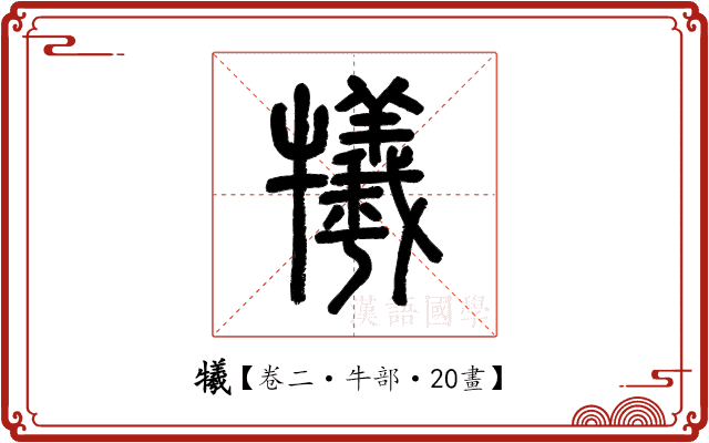 牺,宗廟祭祀用的之牲畜。字形采用“牛”作边旁,“羲”是声旁。
