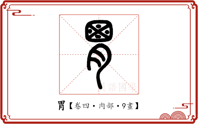 附注《說文新證》:「《說文》以為字从肉,上象胃形。何琳儀《戰國古文字典》以為从肉、从𱕻(𦳊,即屎),會胃臟藏污之意,𱕻亦聲。戰國文字『𱕻』形或訛成目形、或訛成田形、囟形不等。肉形或加區別符號。秦文字『𱕻』形簡化成『田』形,為後世隸楷所本。」