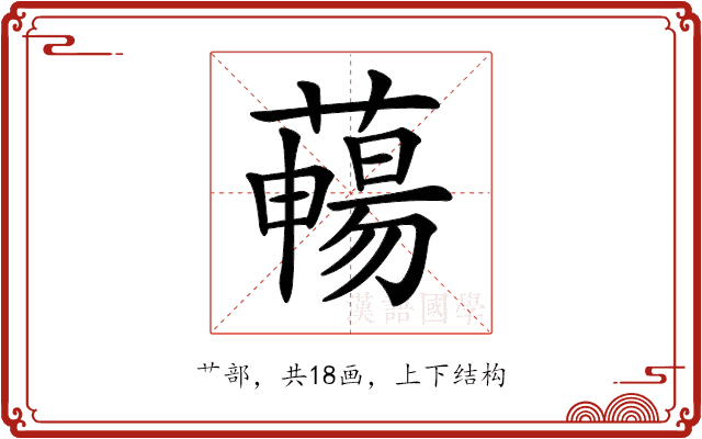 〔𦿄〕字是上下结构,可拆字为“艹、暢”。