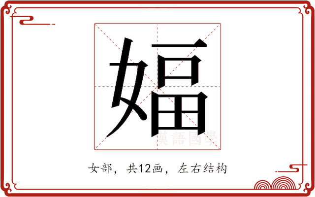 𫱆,位于中日韩统一表意文字扩展区E,Unihan编码U+2BC46,女部,共12画,左右结构。